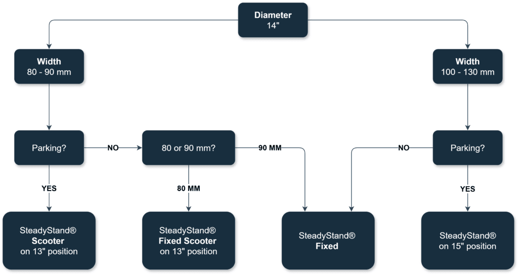 Die Wahl des richtigen SteadyStand für eine Reifengröße von 14 Zoll hängt von mehreren Faktoren ab. Um die beste Lösung zu finden, können Sie das folgende Flussdiagramm verwenden: